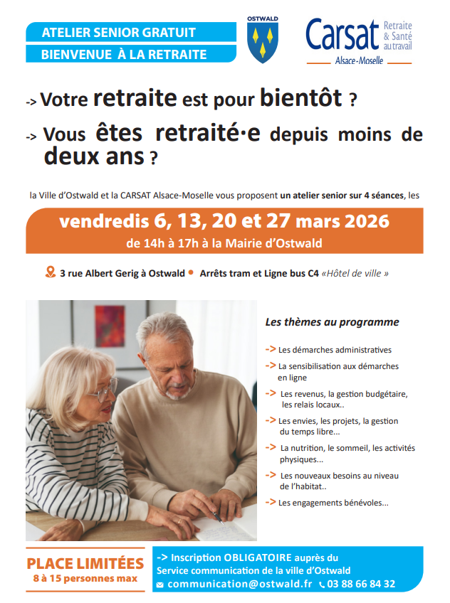 La Carsat Alsace Moselle et la Ville* proposent aux seniors proches de la retraite ou à la retraite depuis peu, un atelier gratuit d’échanges sur cette période de la vie, les vendredis 6, 13, 20 et 27 mars 2026 de 14h à 17h, dans la salle du conseil municipal, 3 rue Albert Gérig.