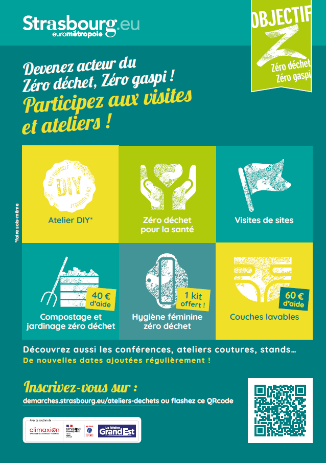 - Atelier famille « Recyclage et zéro déchet, c’est à notre portée ! » : Samedi 26 octobre 2024 de 14h à 16h à Bischheim