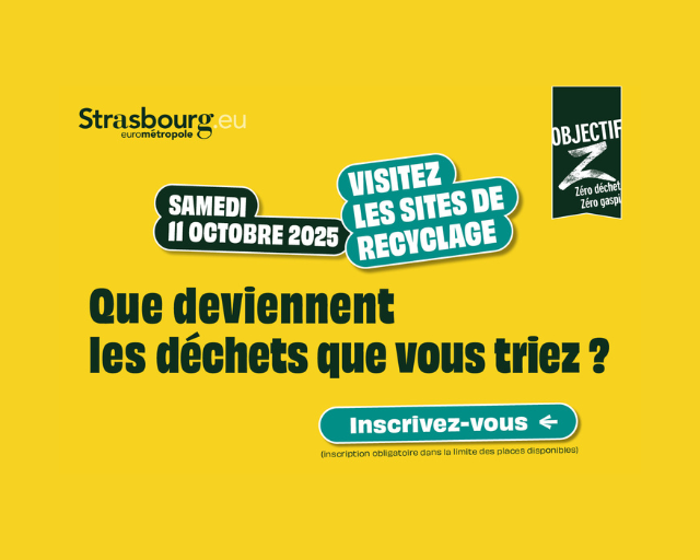 Plusieurs visites sont organisées gratuitement sur inscription (voir lien ci-dessous) : centre de tri des déchets ALTEM – 10 Route du Rohrschollen à Strasbourg (créneaux de 9h30 à 10h30 / 11h à 12h) ou du centre de valorisation des déchets verts (créneaux de 9h30 à 10h30 / 11h à 12h) – 17 route de Rohrschollen à Strasbourg.